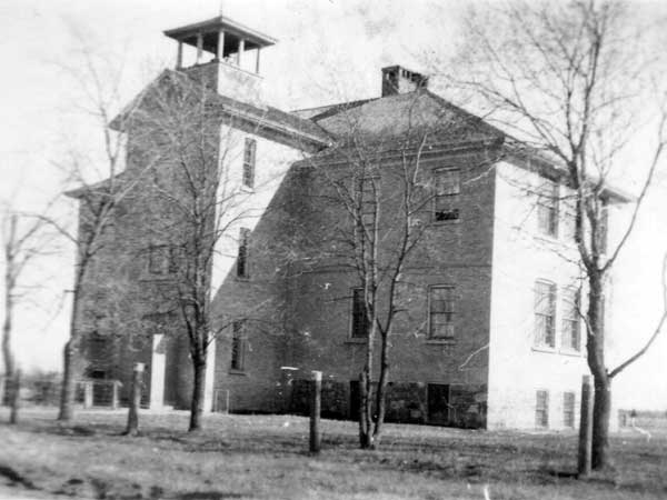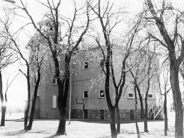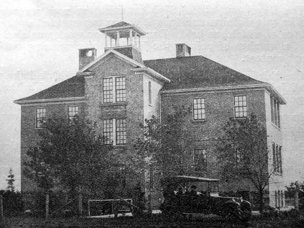 The Kenton Consolidated School building, erected in 1920, was lighted with electricity. There was a teacherage, skating rink, and curling rink on its seven-acre grounds (circa 1921)