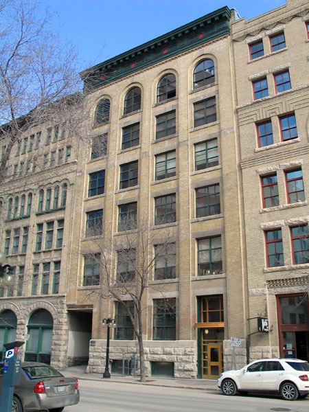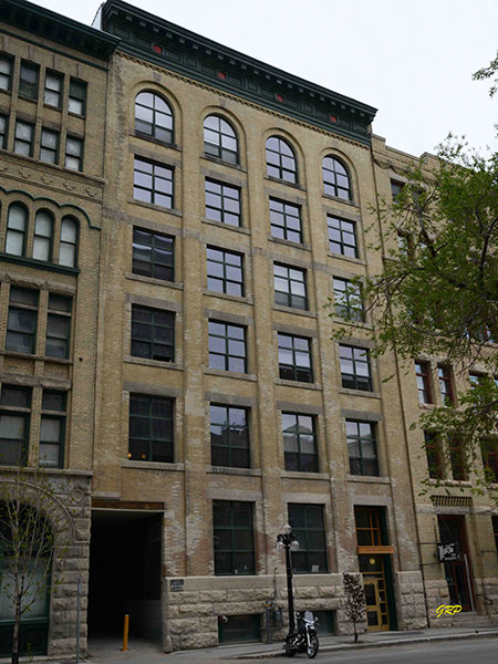 This six-storey brick warehouse on Bannatyne Avenue in Winnipeg was designed by local architect Charles Henry Walker and built between 1904 and 1905 by local contractors Kelly Brothers. Owned initially by Thomas Kelly and Joseph Maw, Kelly owned the entire building by the time of its completion. The original tenants included Kilgour Brothers, a printing and paper manufacturer, wholesale clothier Samuel D. R. Fernie, wholesale stationer W. V. Dawson, iron and brass bed manufacturer H. R. Ives and Company, and the Souris Coal Mining Company.