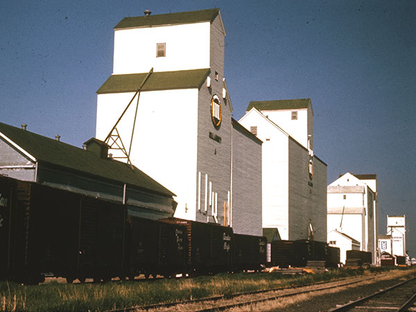 Manitoba Pool grain elevator A at Killarney, with Pool B, UGG, and Paterson elevators in the background (1971)