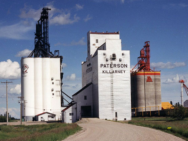 A wooden grain elevator at Killarney, on the CPR Napinka Subdivision in the Municipality of Killarney-Turtle Mountain, was built by Paterson Grain between 1979 and 1980, replacing a smaller elevator built in 1927. Replaced by a larger elevator immediately to its east in 1999, the facility was sold to a livestock feed company.