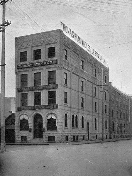 This office-warehouse building was built in 1895 for boot and shoe merchant Thomas Ryan. Designed by the architect Henry Sandham Griffith, the building was originally three storeys tall. In 1903, a fourth floor was added. Three years later, Ryan moved to a new, larger facility at Princess Street and Notre Dame Avenue and this building was occupied by a series of wholesale merchants. It was vacant for four years before becoming the home of an auction company in 1977. After that firm moved out, the building remained vacant and its maintenance was neglected.