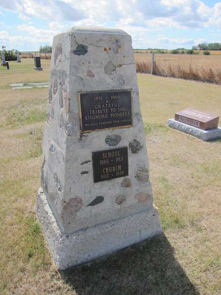 Inside this cemetery in the Rural Municipality of Wallace-Woodworth is a fieldstone monument commemorating pioneers of the Kinsmore district, Kinsmore School No. 371 (1885-1913) which later consolidated with Lenore School No. 628, and Kinsmore Church (1907-1934).