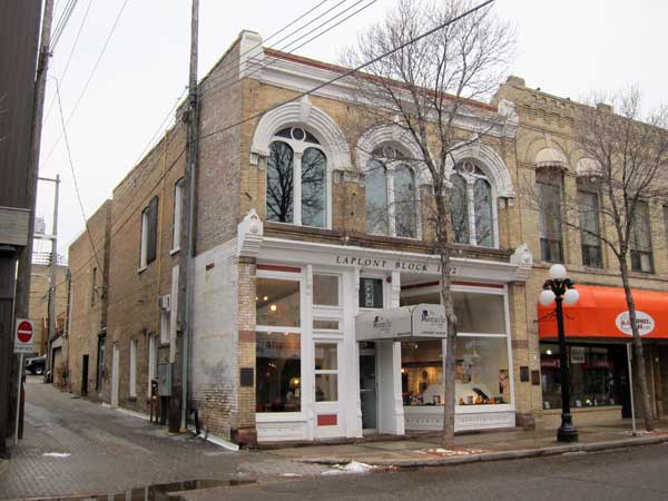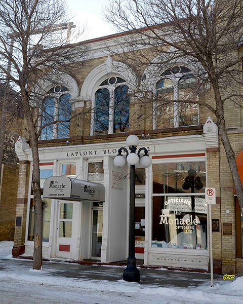 The two-storey brick LaPlont Block was designed and constructed in 1892 by Brandon contractor Frederick J. Chubb for businessman John LaPlont, who operated a barbershop and cigar store here until 1900 when he sold the building to the Confederation Life Association which occupied it until 1902.