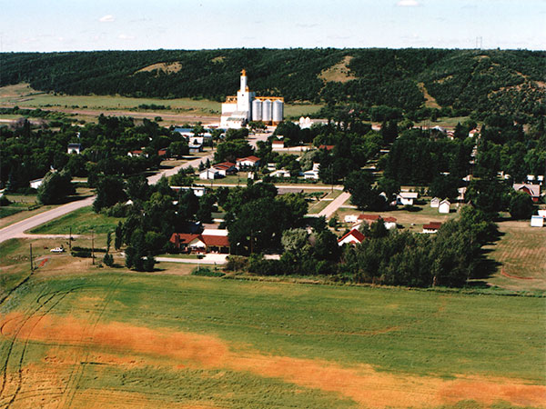 Aerial view of the Manitoba Pool grain elevator at La Riviere (1995)