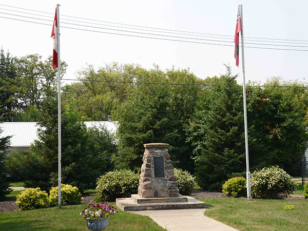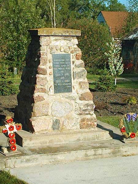 This monument at La Riviere, in the Municipality of Pembina, was dedicated to those from the La Riviere and Snowflake areas who gave their lives in the First World War and Second World War. It was built in 1961, at Snowflake, by members of Border Branch No. 207 of the Royal Canadian Legion, using stones from an old house. The house, originally built in 1901, had been demolished in 1960. The monument was moved to La Riviere on 10 July 2006 after the Border Branch had surrendered its charter in 1986.