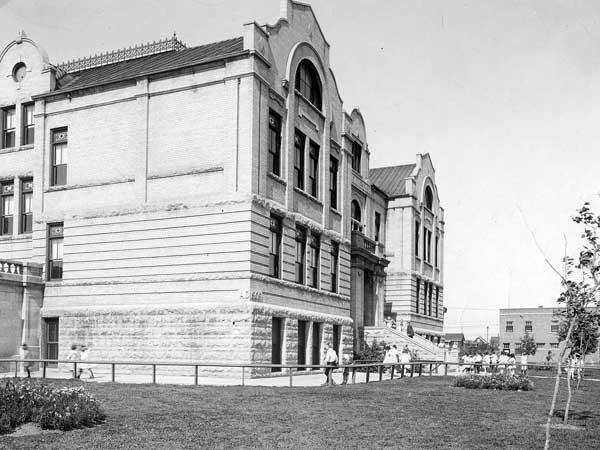 La Verendrye School, one of Winnipeg’s grandest old schools from the boomtown era, is set perfectly between Jessie Avenue and Warsaw Avenue on Lilac Street. Though residential and business areas quickly grew up around it, when it opened in 1909 La Verendrye School was on the outskirts of the developing city. Reporting on the school’s cornerstone laying on 8 July 1909 by Ward 1 Trustee Frederick Charles Hubbard, the Manitoba Free Press wrote, “Yesterday visitors journeyed to the ground or within 100 yards of it by electric car and found there was still something of Winnipeg beyond them, though the streets lose some of their garb of traffic and dwellings are hidden in areas of native bush.”