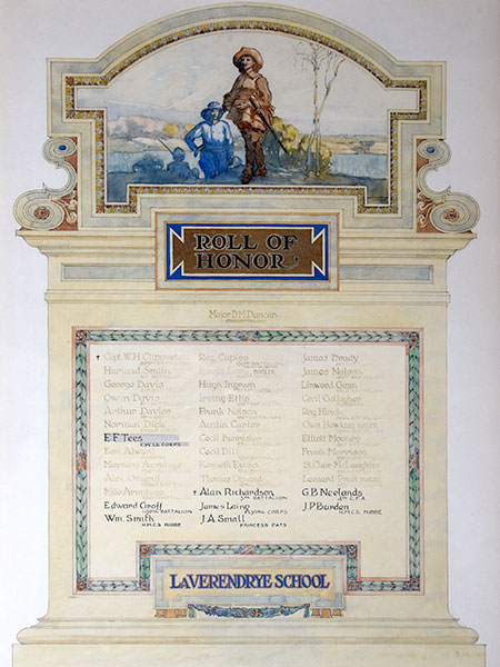 A school has an Honour Roll of students and staff killed during the First World War, commissioned in 1916 by school principal William Henry Clipperton who later enlisted and was killed in action.
