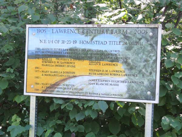 A sign at this site in the Rural Municipality of Dauphin, erected in 2005, commemorates Hoover and Sarah Lawrence, who farmed here beginning in 1905, and their descendants.
