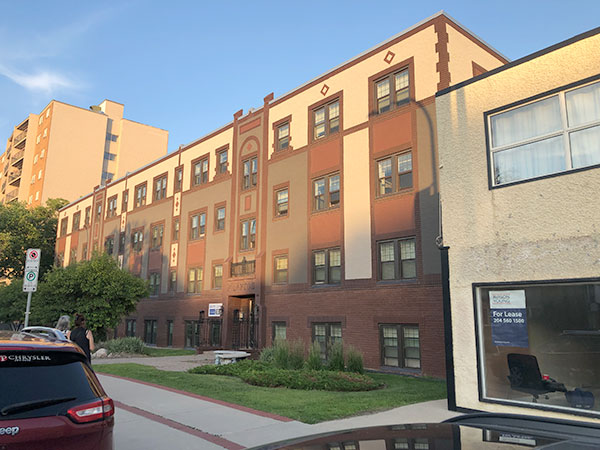 This three-storey brick and concrete block on Corydon Avenue in Winnipeg, measuring 135 feet by 43 feet, was designed by local architect James William Hawker. It was constructed in 1931 by the Moxam Construction Company, with brick and concrete work done by Walter Hanson Iverson, at a cost of about $100,000. In its original configuration, the building contained 30 apartments, each equipped with a fireplace in the living room, electric refrigerator in the kitchen, and built-in bath in the bathroom. Smith Agency Limited were the rental agents for the building.