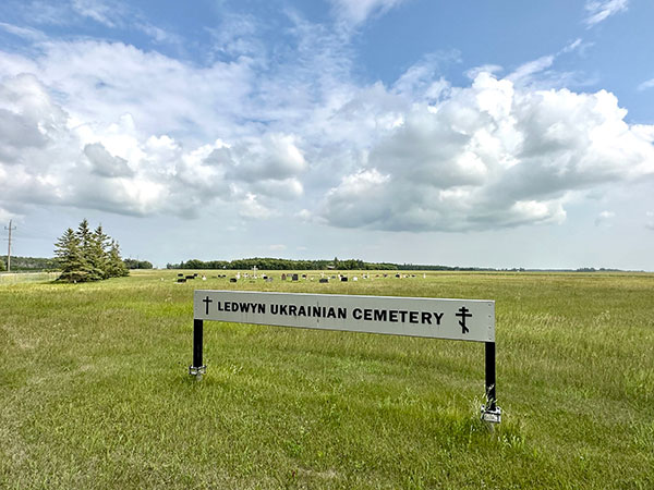 This Ukrainian Orthodox cemetery at Ledwyn in the Municipality of Bifrost-Riverton is situated across the road from an associated church. The first burial is of Stefan Lahodowski from 1917. He and his wife Rosalia were among the first settlers arriving in the Ledwyn area in 1907.