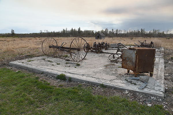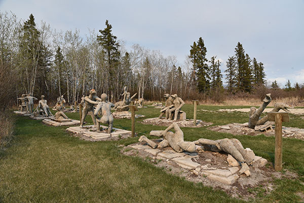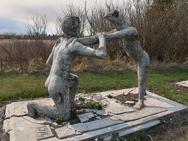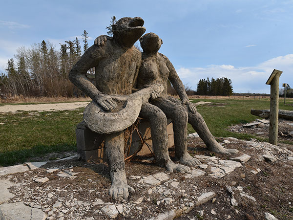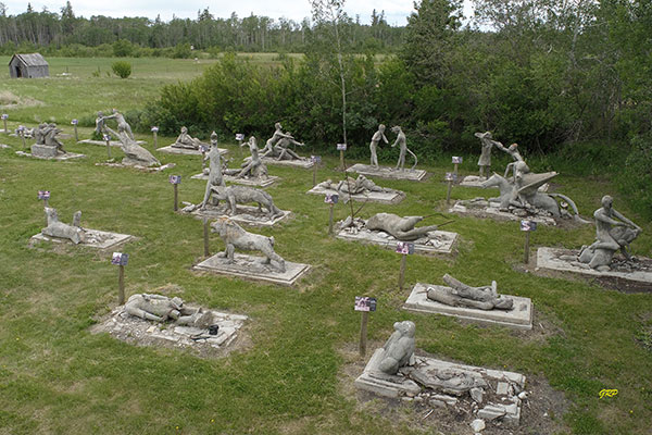 A gallery of concrete sculptures at a farmstead in the Rural Municipality of Grahamdale, settled by Belgian immigrant Armand George Lemiez, were created between 1967 and 1976. Themes of the Lemiez sculptures range from politics to religion and mythology, as well as a self-portrait. His efforts to have the site designated as a provincial park were ultimately unsuccessful and the sculptures were subsequently damaged by weather and vandals. More recently, interpretive signage has been installed and the site was well maintained at the time of a 2021 visit. A large collection of Lemiez’s oil paintings, now lost, were formerly displayed in a cinder-block building on the site known as the Pioneers Memorial Gallery.