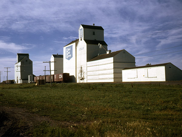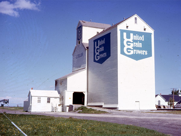 United Grain Growers grain elevator at Letellier, with the Manitoba Pool grain elevator in the left background (no date)
