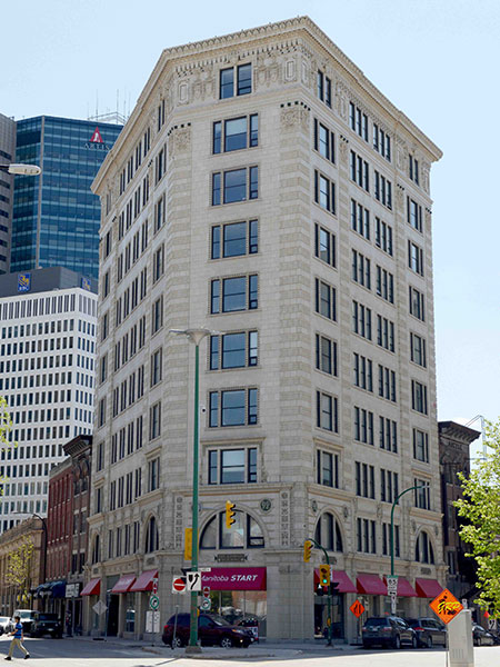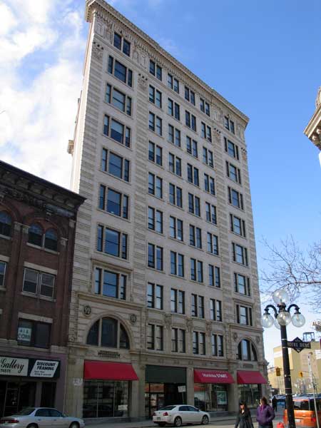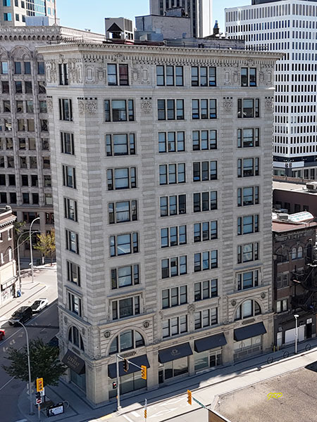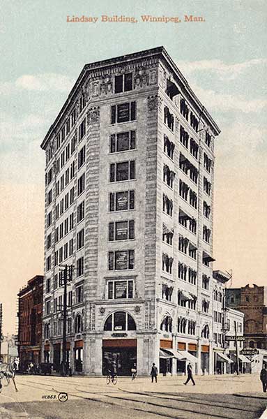 Designed for entrepreneur Frank Lindsay by local architects John Woodman and Raymond Carey, this ten-storey office building was built over a 14-month period in 1911-1912 by the Kelly-Simpson Construction Company at a cost of $193,000. Major long-term tenants of the building included insurance companies; medical, legal and other professional firms; and the CJOB radio station. In 2004, the building (a municipally-designated historic site) was recognized with a Heritage Winnipeg Preservation Award.