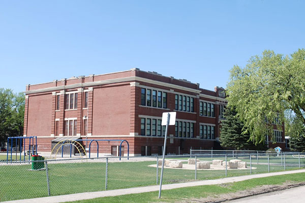 Within a few years, tents were needed to reduce classroom overcrowding. As the local population grew, so did the need for classroom space. In late 1913, the district hired Winnipeg architect Alexander Melville to design a new and much larger building. The project was managed by the Frid-Lewis Company and work began before the year’s end. Its distinctive red brick and limestone exterior featured entrances on the west side labeled “Boys” and “Girls.” It was completed at a cost $175,000 and opened at a ceremony on 25 November 1914 attended by Education Minister George Robson Coldwell and Deputy Minister Robert Fletcher.