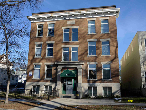 This three-storey brick and stone block on Furby Street in Winnipeg, measuring 42 feet by 132 feet, was designed by local architect Edmund Walter Crayston and built in 1912 by contractor J. Braden. It had 20 apartments in its original configuration. In 1929, one of two apartments in its basement was converted into two small apartments, resulting in 21 apartments in the building today.