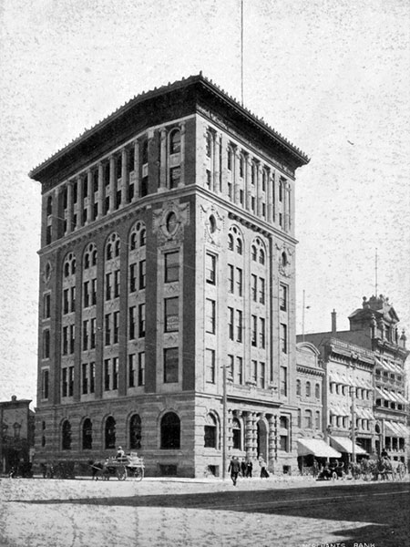 This site in Winnipeg, on the east side of Main Street at the corner of Lombard Avenue, was formerly occupied by the Inter-Ocean Hotel. That building was demolished in mid-1913 to allow expansion of the neighbouring Merchants Bank Building, designed by the Toronto-based architectural firm of Darling and Pearson, and built in 1902. The seven-storey brick structure provided space for a range of commercial and professional offices. In late 1923, following the 1921 merger of the Merchants Bank of Canada with the Bank of Montreal, it was renamed the Lombard Building.