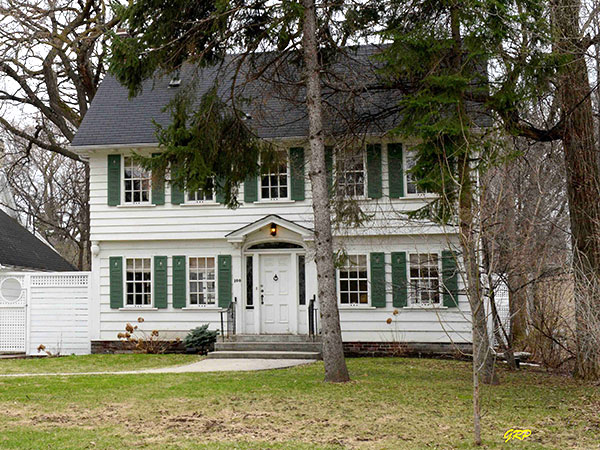 This two-storey wood frame residence in the Armstrong’s Point area of Winnipeg was built in 1930 for lawyer T. Mackay Long.