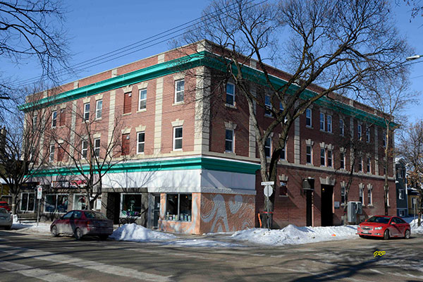 This three-storey brick and stone building at the northwest corner of Evanson Street and Westminster Avenue in Winnipeg, measuring 80 feet by 100 feet, was designed by local architect William Fingland and built in 1911 by owner Peter MacKissock at a cost of about $100,000. There were five commercial spaces on the main floor facing Westminster with the remainder, and the upper two floors, containing 20 residential apartments.
