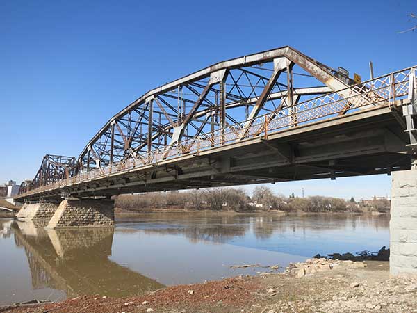 In 1910, this steel through-truss structure was built as a replacement for the original bridge. It consisted of two outer spans measuring 203 feet long by 26 feet wide with a central swing span measuring 277 feet long by 26 feet wide. The swing span was designed to pivot to allow ships to pass underneath. The concrete piers were constructed by William Newman and Company while the steel structure was built by the Algoma Steel Bridge Company. The bridge was built at a cost of about $126,000. The bridge originally featured two sets of railway tracks for the Winnipeg Electric Company’s streetcars but these were removed after the system was decommissioned in 1955.