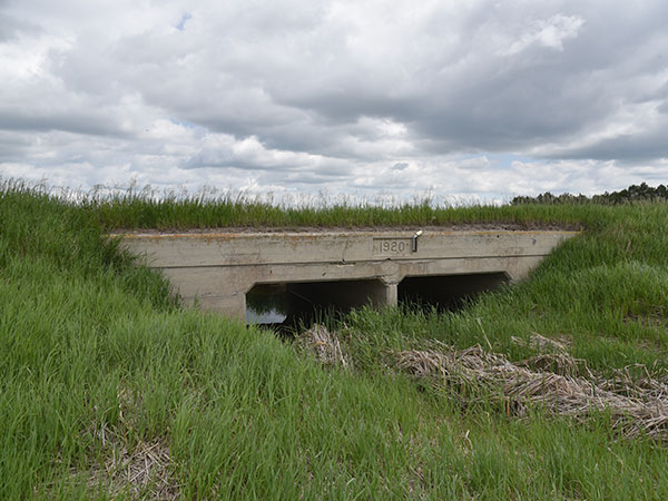 This concrete culvert bridge in the Municipality of Louise was constructed in 1920 by the Winnipeg-based construction firm of Lacour & Schioler, using Plan 547, for $2,337.