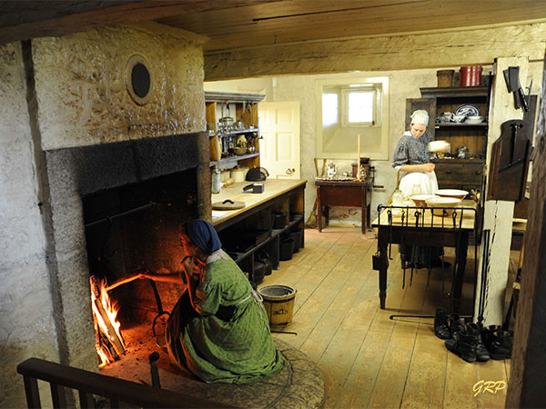 The Furloft and Saleshop, built in 1830-1831, is located inside the walls of the fort in the southeast corner, directly across the grounds from a identical warehouse building dating from 1838. It is a two-and-a-half storey, rectangular structure constructed of limestone with a medium pitched hip roof, topped by two stone chimneys, and three gable dormers on each side.