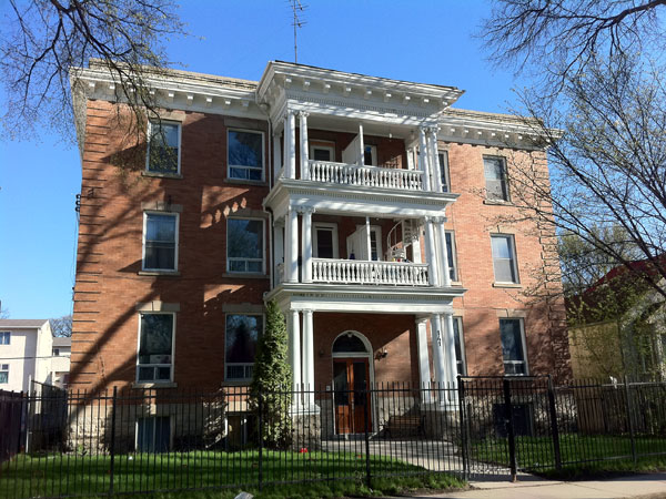 This three-storey brick apartment block on River Avenue in Winnipeg, measuring 52 feet by 56 feet, was designed by local architect Norman McNab Moffat and constructed in 1906 by contractor Alexander Beattie Anderson for lumber dealer James Harkness Ludlow at a cost of about $22,000. The building contained nine apartments. The Ludlow Court was an early example of a luxury block, built in Winnipeg’s rapidly growing Fort Rouge area. The Ludlow family occupied one of the ground-floor suites until the 1970s. The building is a municipally-designated historic site.