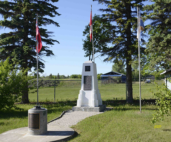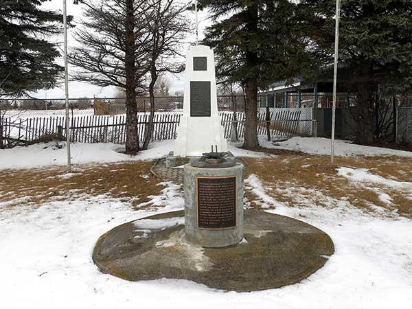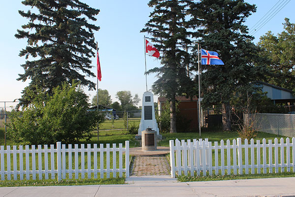 This monument in Lundar in the Rural Municipality of Coldwell was erected in 1955 to commemorate the Icelandic pioneers of Lundar, Westfold, Otto, and Markland, who arrived in this region in 1887.
