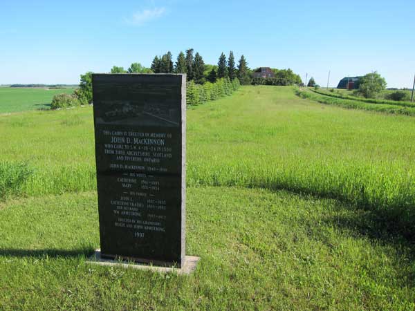 This monument in the Municipality of Rossburn was erected in 1997 in memory of John D. MacKinnon (1849-1930) by his grandsons, Hugh and John Armstrong. MacKinnon came from Tiree Argyleshire, Scotland and Tiverton, Ontario in 1880 and homesteaded at SW4-19-24W. He had two wives, Catherine (1861-1893) and Mary (1851-1934), and two children.