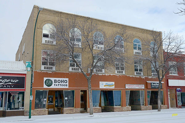 This three-storey brick building along Main Street in Dauphin was constructed in 1906 by local farmer and businessman Andrew Malcolm (1842-1920) and his son Thomas Malcolm. A fire on 30 December 1912 destroyed much of the building’s interior, with the facade of only the top two floors surviving.