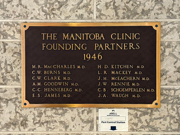 Located within the Manitoba Clinic Building on Sherbrook Street in Winnipeg, a bronze plaque commemorates the founding physicians of the Manitoba Clinic.