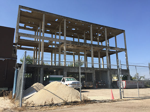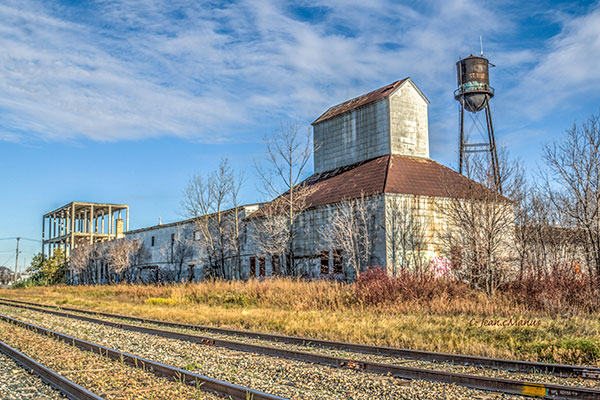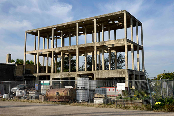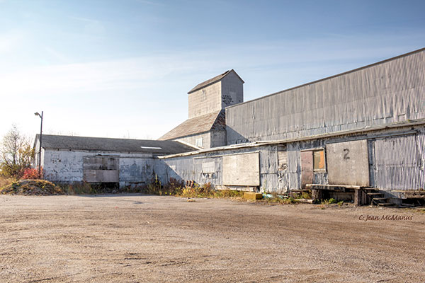 Former McCabe grain elevator with warehouse and whisky distillery in background (October 2015)