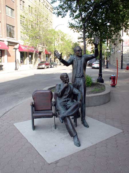 Ontario artist Ruth Abernethy’s “Imagine” was commissioned to celebrate the 50th anniversary of the Royal Manitoba Theatre Centre. Unveiled in November 2008, it features John Hirsch (standing), founding Artistic Director, and Tom Hendry (seated), its first Business Manager. Nearby is a plaque unveiled by the Historic Sites and Monuments Board of Canada.