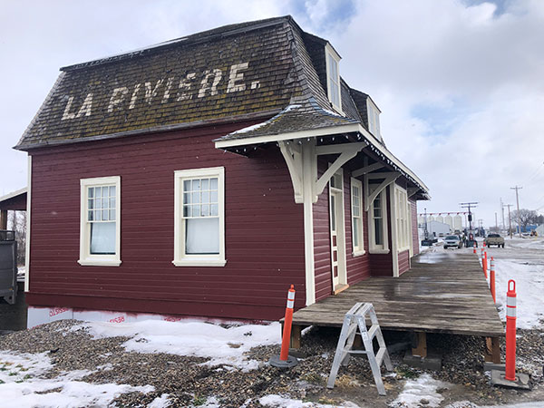 Former Canadian Pacific Railway station from La Riviere at Manitou (November 2023)