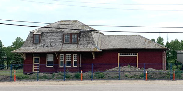 Former Canadian Pacific Railway station from La Riviere at Manitou (June 2023)