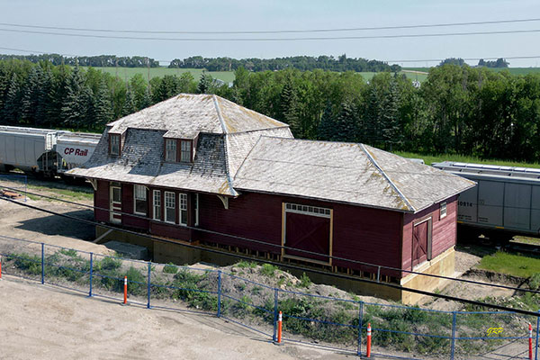 Aerial view of the former Canadian Pacific Railway station from La Riviere at Manitou (September 2025)