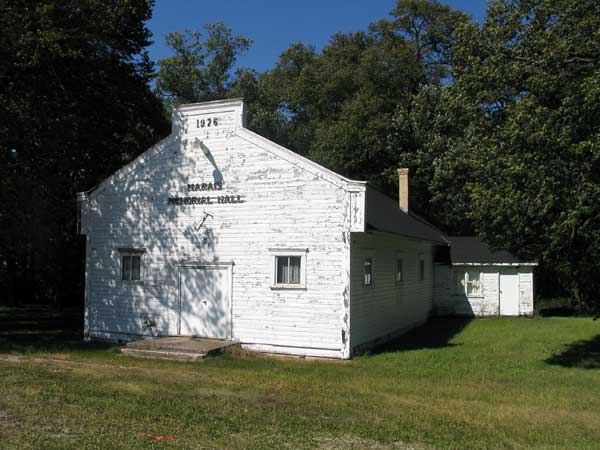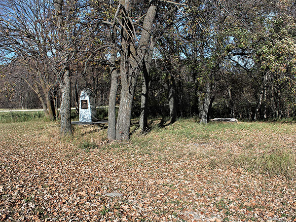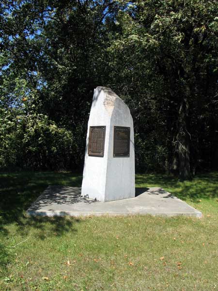 This monument in the Rural Municipality of Montcalm stands beside the Marais Memorial Hall. The hall was constructed here in 1926 by community volunteers and was designated a “temperance hall”. It complemented the church a mile south and the school across the road to the west. The hall was the focal point of the community: hosting suppers, dances, family gatherings, ploughing matches, whist drives, Mother’s Day teas, and the annual Christmas concerts. It survived floods of 1950, 1974 and 1997. The plaque was unveiled on 2 July 2000. Another plaque on the monument, unveiled in July 1930, lists the names of pioneers in the Marais district between 1870 and 1890.