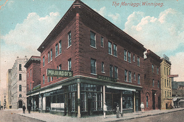 This three-storey brick structure on McDermot Avenue, in the Exchange District of Winnipeg, was constructed in early 1902 and supervised by local architect William Barnes Lait on behalf of hotelier Frank Mariaggi. Known initially as the Alexandra Block, the main floor was intended to house a large restaurant and stores, while the upper two levels were going to be “suites for bachelors.” Within a year, Mariaggi had turned the building into a hotel with single rooms and suites each equipped with telephone and bath, separate dining rooms for women and men, and a private dining room in a basement grotto that was meant to resemble Italian caves.