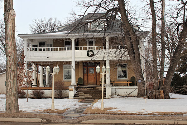 This two-storey brick house in Portage la Prairie was built in 1913 for Samuel Reid Marlatt. The Greek Revival structure features huge columns that support the roof and second floor verandah.
