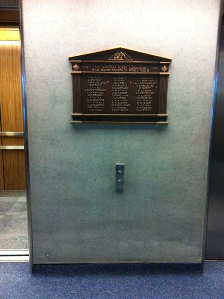 A plaque designed by metalworker Percy Robert Marsh commemorates employees of the Manitoba Power Commission who served with Canadian military forces during the Second World War, from 1939 to 1945. Those marked with a cross were killed in action.