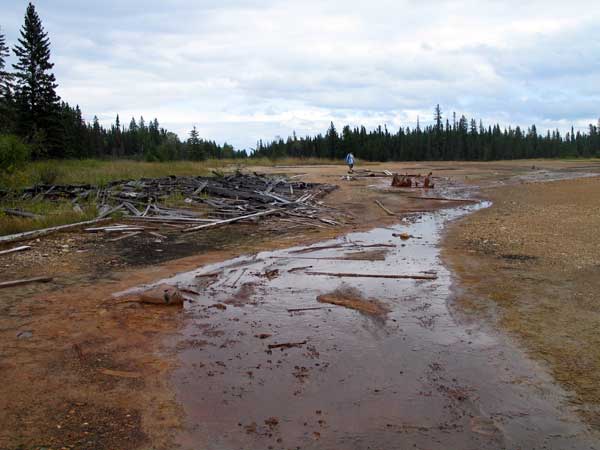 Wood from the former salt-making buildings, and the well crib used to obtain salt water, are still visible at this site along Manitoba Highway 10.