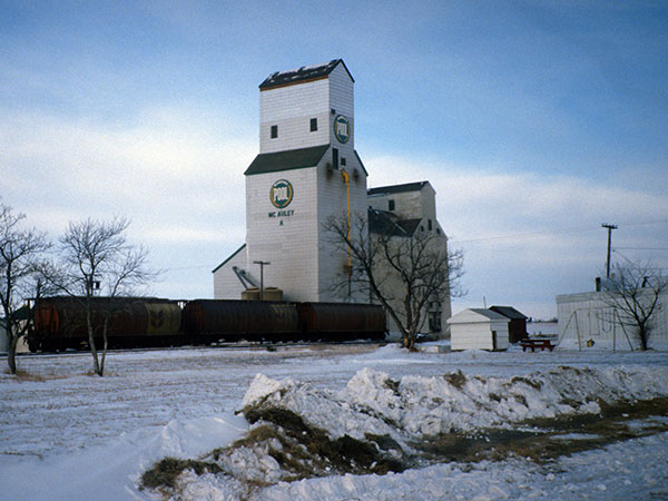 A 30,000-bushel wooden grain elevator at McAuley, on the CPR Rocanville Subdivision in what is now the Rural Municipality of Ellice-Archive, was built in 1928 by Manitoba Pool Elevator. In 1956, its capacity was doubled with the construction of a crib annex beside it. Twelve years later, a 50,000-bushel elevator was built on the opposite side of the annex and the old elevator was turned into a second annex. Renovated in 1985, the facility was badly damaged by strong winds on 9 August 1995. Despite a public campaign to save it, the elevator was closed and later demolished.