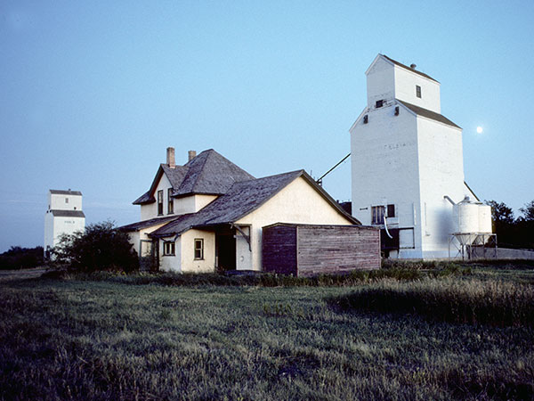 McConnell railway station (now at the Hamiota Pioneer Club Museum) with the Manitoba Pool A elevator at right and the B elevator at left (August 1983)