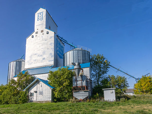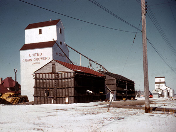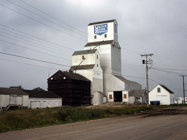 The first United Grain Growers elevator at McCreary, on the CNR Gladstone Subdivision in what is now the Municipality of McCreary, with a 30,000-bushel capacity, opened in 1917. Two balloon annexes were added to its east side, next to the driveway, around 1951 and its capacity rose to 85,000 bushels. Around 1961, one of the balloon annexes was moved to the south side and enlarged. In 1977, the old elevator was converted into an annex and a new elevator was built beside it. An opening ceremony, attended by UGG President Mac Runciman, occurred on 20 July 1977. The original elevator and its balloon annex were demolished around 1981. Steel tanks on the south and north sides were added around 1995, increasing the total capacity to 141,000 bushels. Closed in 2001, the elevator was sold into private ownership. At the time of a 2017 visit, the elevator appeared unused, with trees encroaching on its driveshed.