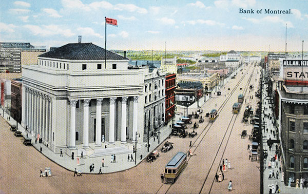 Main Street south from Portage Avenue, with the Victory Building to the right/south of the Bank of Montreal (c1914)