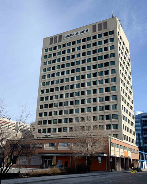 This fifteen-storey, steel-reinforced concrete building on Kennedy Street in Winnipeg was designed by architect Helmut J. Peters of the firm Moody Moore Duncan Rattray Peters Searle and Christie to provide offices for more than 150 physicians and dentists, laboratory and x-ray facilities, two pharmacies and two optical dispensaries, and a bank and restaurant on its lowest two floors. It replaced an earlier structure (dating from 1922) that stood to the immediate north, and is now a parking lot. The building was constructed between March 1972 and June 1974 by Bird Construction at a cost of about $5 million.