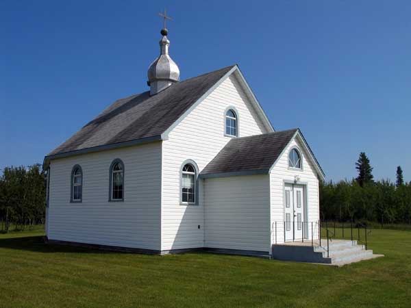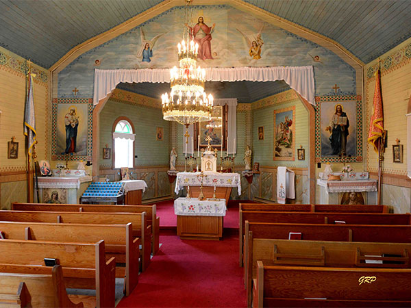 Built between 1922 and 1923, the interior walls and ceilings of this church at Meleb, in the Rural Municipality of Armstrong, are adorned with paintings by artist Jacob Maydanyk. On the grounds is a marker commemorating Peter Trakalo, a member of the Queen’s Own Cameron Highlanders of Canada who was killed on 16 August 1944 at the age of 27 years, and who lies in an unmarked grave in France.