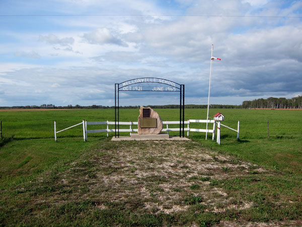 The Mellonville School District was organized formally in March 1921 in response to a petition from local residents. A wood-frame, one-room schoolhouse was erected at this site in the Rural Municipality of Alonsa and classes began on 3 October 1921 with teacher Clara Sanderson. It was transferred from the Westbourne School District to that of Alonsa in May 1938. School amalgamation during the 1960s led to its closure on 30 June 1965. The school building was destroyed by fire on 3 September 1972. It is commemorated by a monument at the site, erected on 12 August 2000, that lists some of the students and teachers of the school.