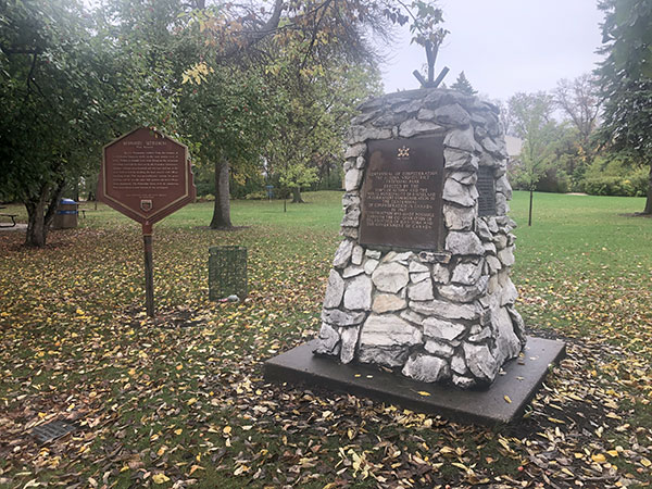 Beside the monument is a monument, erected in 1967 by the Town of Altona and Rural Municipality of Rhineland, to commemorate the centenary of Canadian Confederation. A plaque on its side was added at the 25th anniversary of the Altona Centennial Park and commemorating the ten people who served on the original board. The cairn was erected on 28 July 1967.