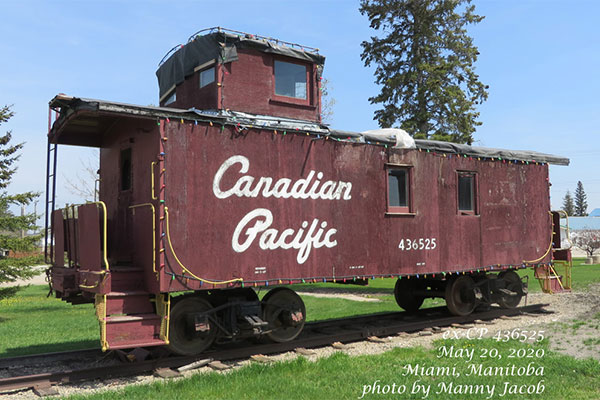 Former CPR caboose at the Canadian National Railway station at Miami (May 2020)