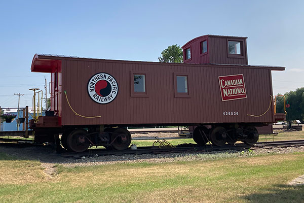 Former CPR caboose at the Canadian National Railway station at Miami (June 2023)